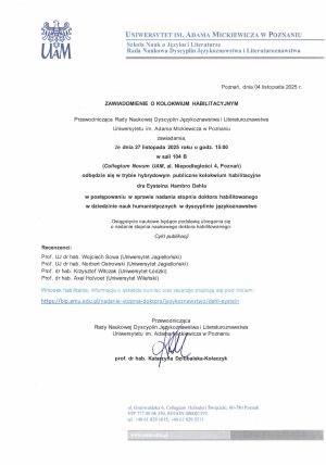 Przewodnicząca Rady Naukowej Dyscyplin Językoznawstwa i Literaturoznawstwa Uniwersytetu im. Adama Mickiewicza w Poznaniu zawiadamia, że dnia 27 listopada 2025 roku o godz. 15:00 w sali 104 B (Collegium Novum UAM, al. Niepodległości 4, Poznań) odbędzie się w trybie hybrydowym publiczne kolokwium habilitacyjne dra Eysteina Hambro Dahla w postępowaniu w sprawie nadania stopnia doktora habilitowanego w dziedzinie nauk humanistycznych w dyscyplinie językoznawstwo